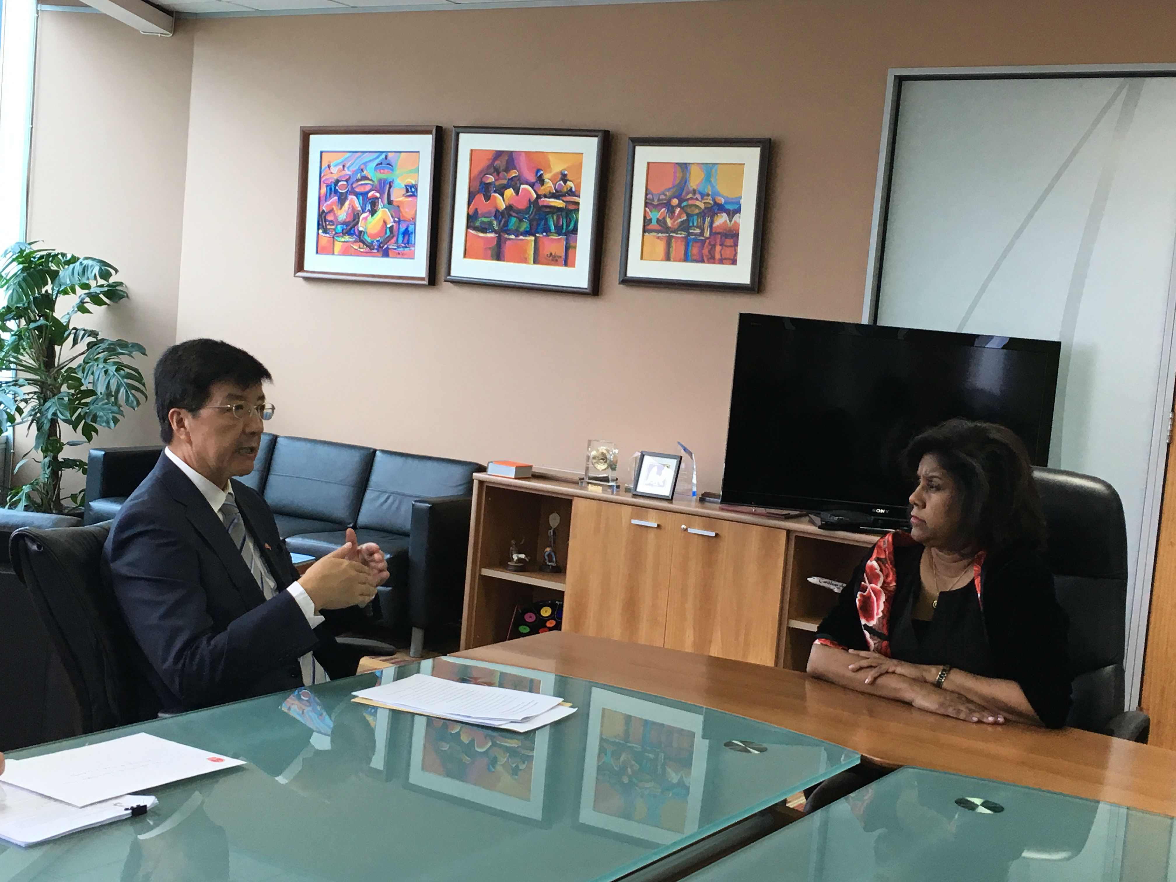 11月20日,宋昱旻大使会见了特多贸易和工业部部长斯库恩。宋大使向斯库恩部长宣介了中国国际进口博览会的有关情况,递交了商务部部长钟山欢迎其参加首届中国国际进口博览会的邀请函及招展手册。同时,双方就中特双边经贸交流与合作方面交换了意见。经商处陪同参加了会见。